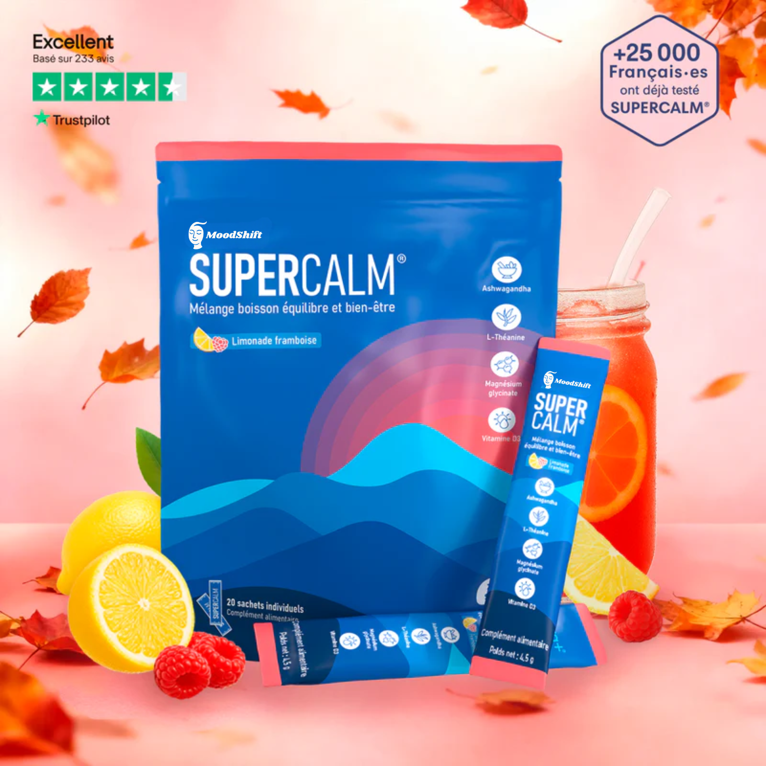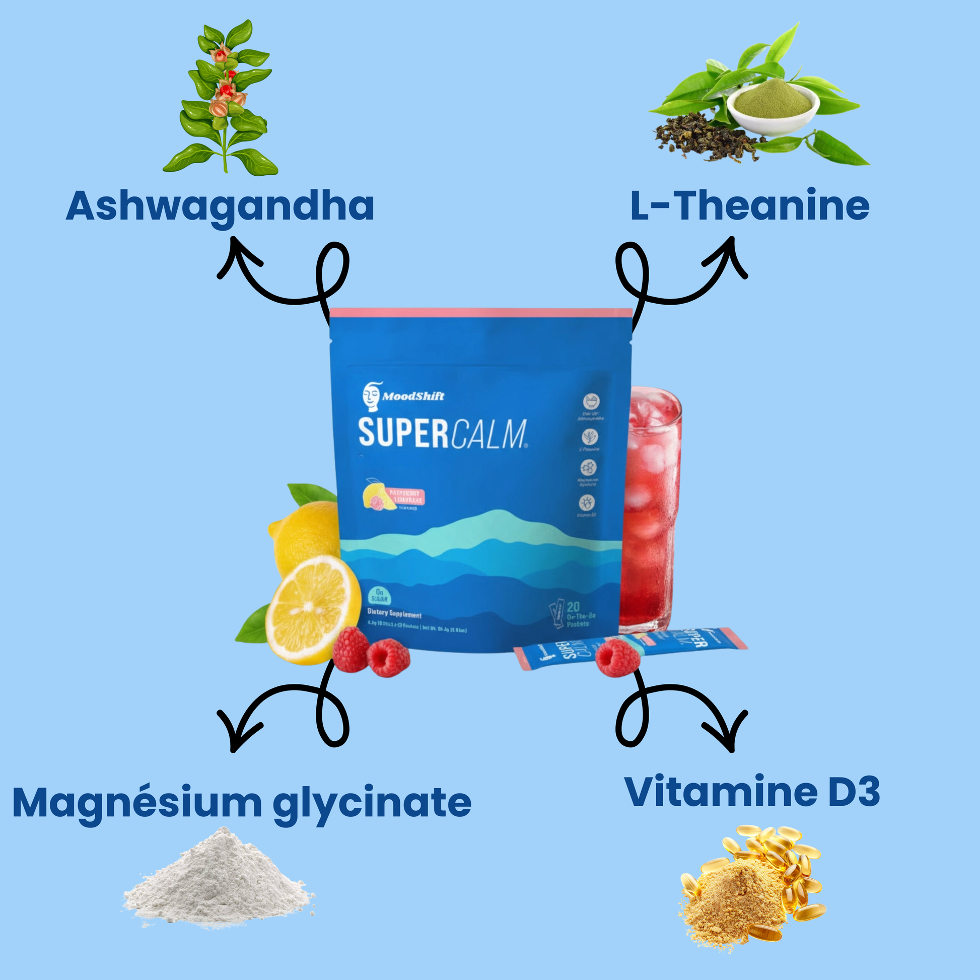 MoodShift contient des actifs adaptogènes (rhodiola, ashwagandha, L-théanine, magnésium) connus pour réguler le cortisol, l’hormone du stress.