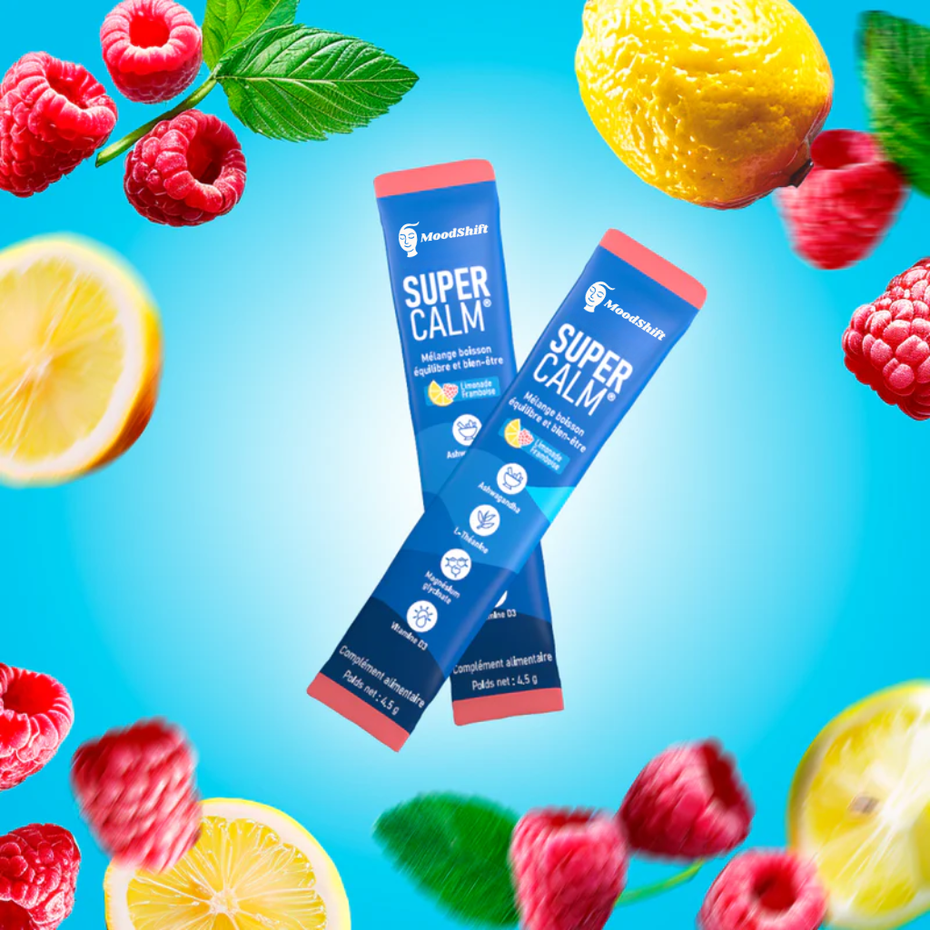 Profite d'une boisson calmante en un instant. Verse simplement ton sachet SuperCalm dans un verre d'eau, mélange avec l'agitateur électrique offert, etressens immédiatement les effets apaisants.Un geste simple,des effets puissants pour ton bien-être quotidien !
